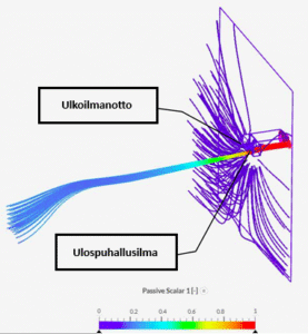 Kuva 2. RVN 3D CFD -simulaatiomalli osoittaa, että pitkä ulospuhallusilman heittopituus estää tehokkaasti ulko- ja poistoilman sekoittumisen.