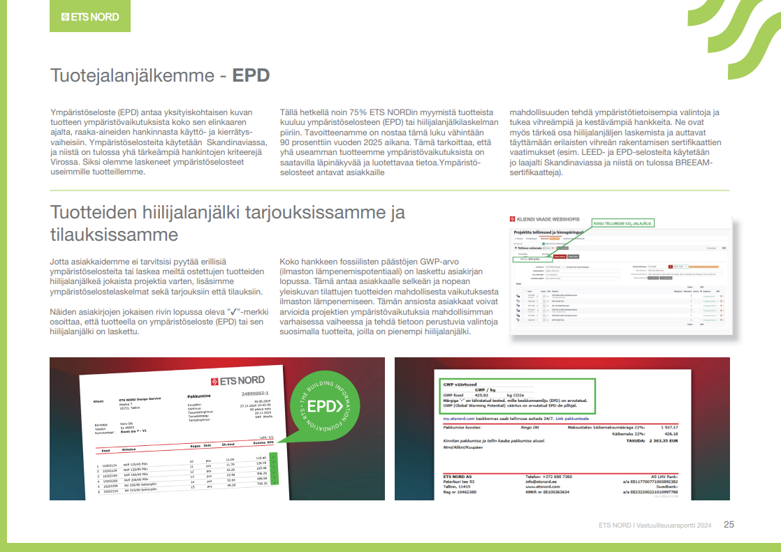 Edistääksemme toimitusketjujemme läpinäkyvyyttä ja ohjataksemme tuotekehityksemme valintoja yhä vastuullisempaan suuntaan olemme laskeneet noin 75 % oman tuotantomme CO2-jalanjäljistä ja laatineet EPD-ympäristöselosteet seuraaville tuotteille: