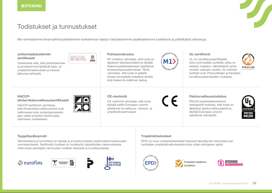 ETS NORDin vastuullisuusraportit esittelevät periaatteitamme ja toimiamme ympäristöystävällisten ilmanvaihtoratkaisujen kehittäjänä.